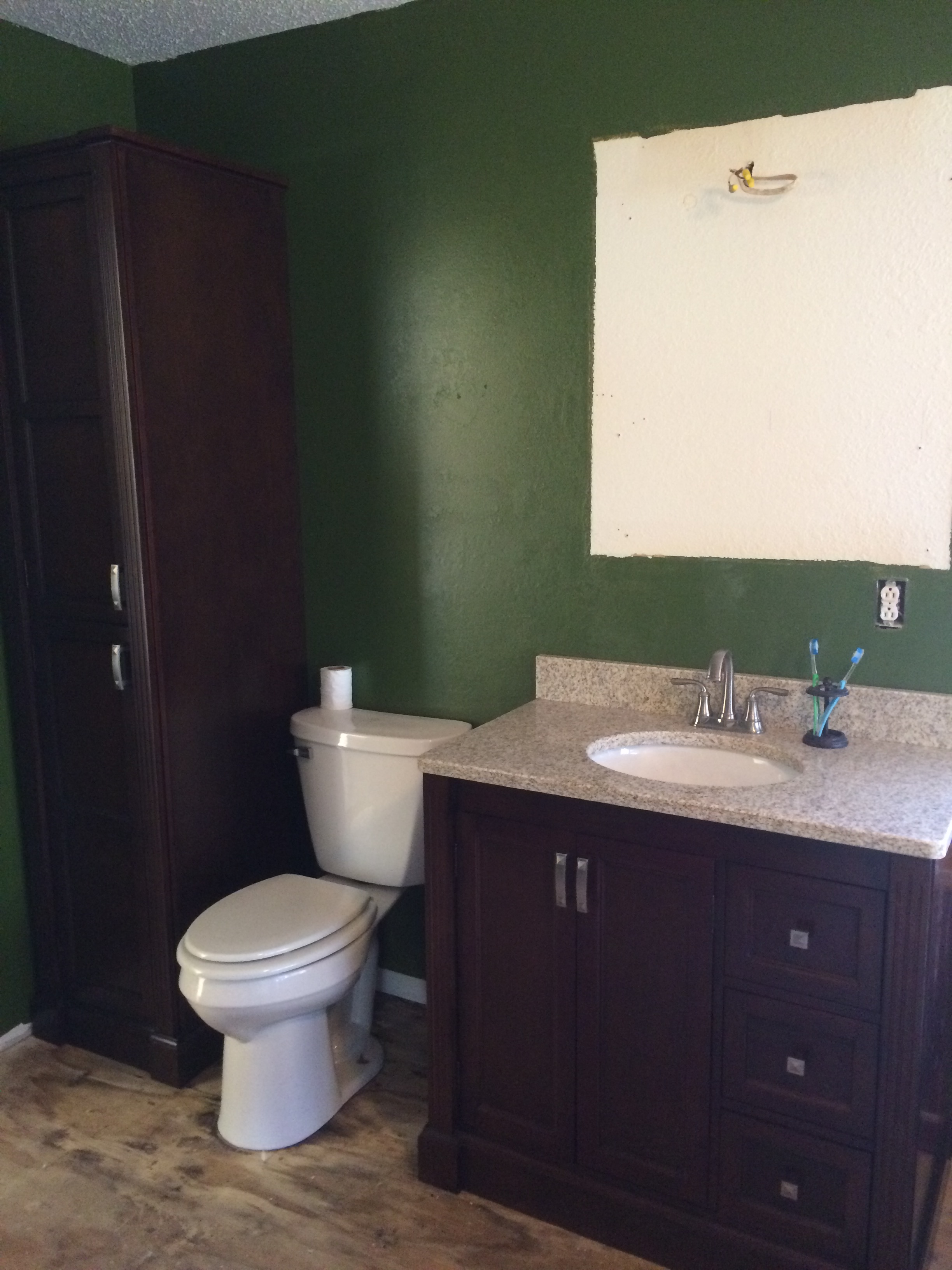 Currently, we’ve updated the bathroom with a new vanity and linen cabinet; the mirror will follow this week. And now that we’ve changed everything else, seems the shower needs a facelift too . . . hmmm.