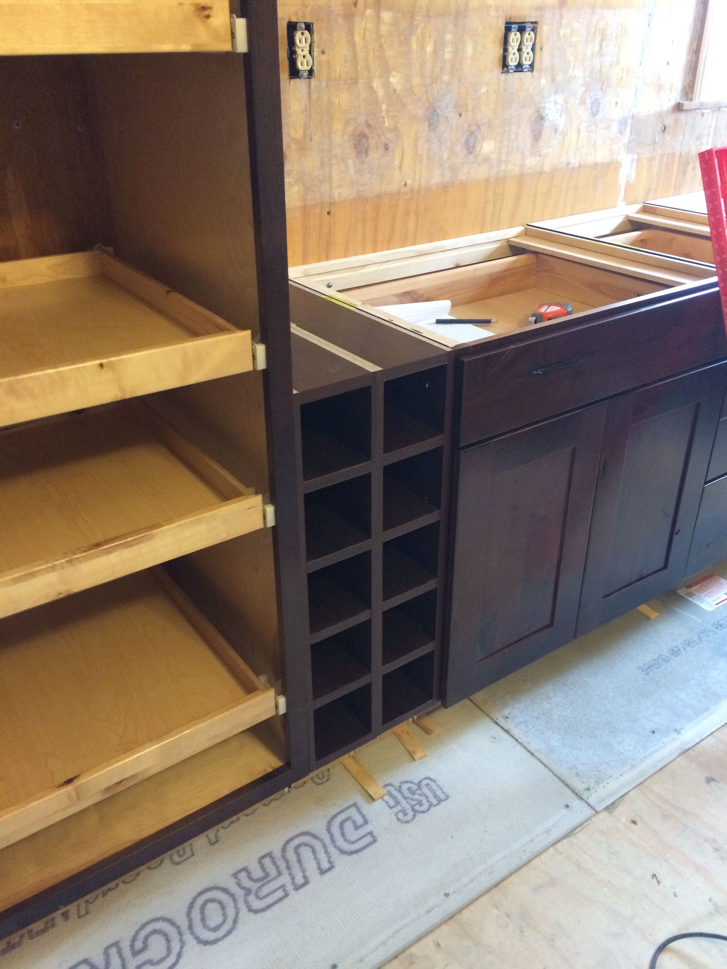 So the base cabinets got set. Remember now, we ordered this stuff the end of October, so I’d pretty much forgotten all the cool stuff—a bread box, a knife drawer, pull-out spice racks and pan holders, and a mixer shelf that lifts up. And the wine racks, of course.