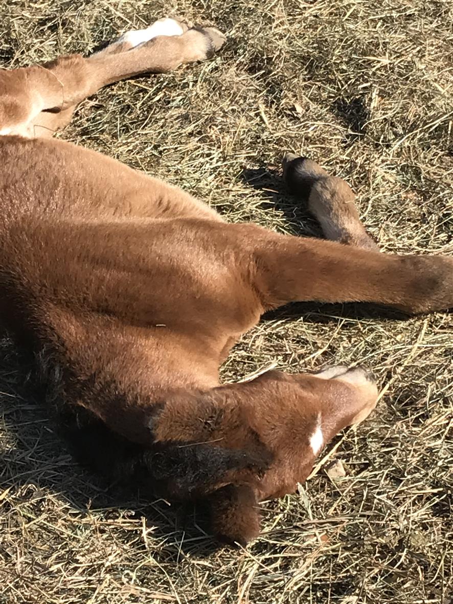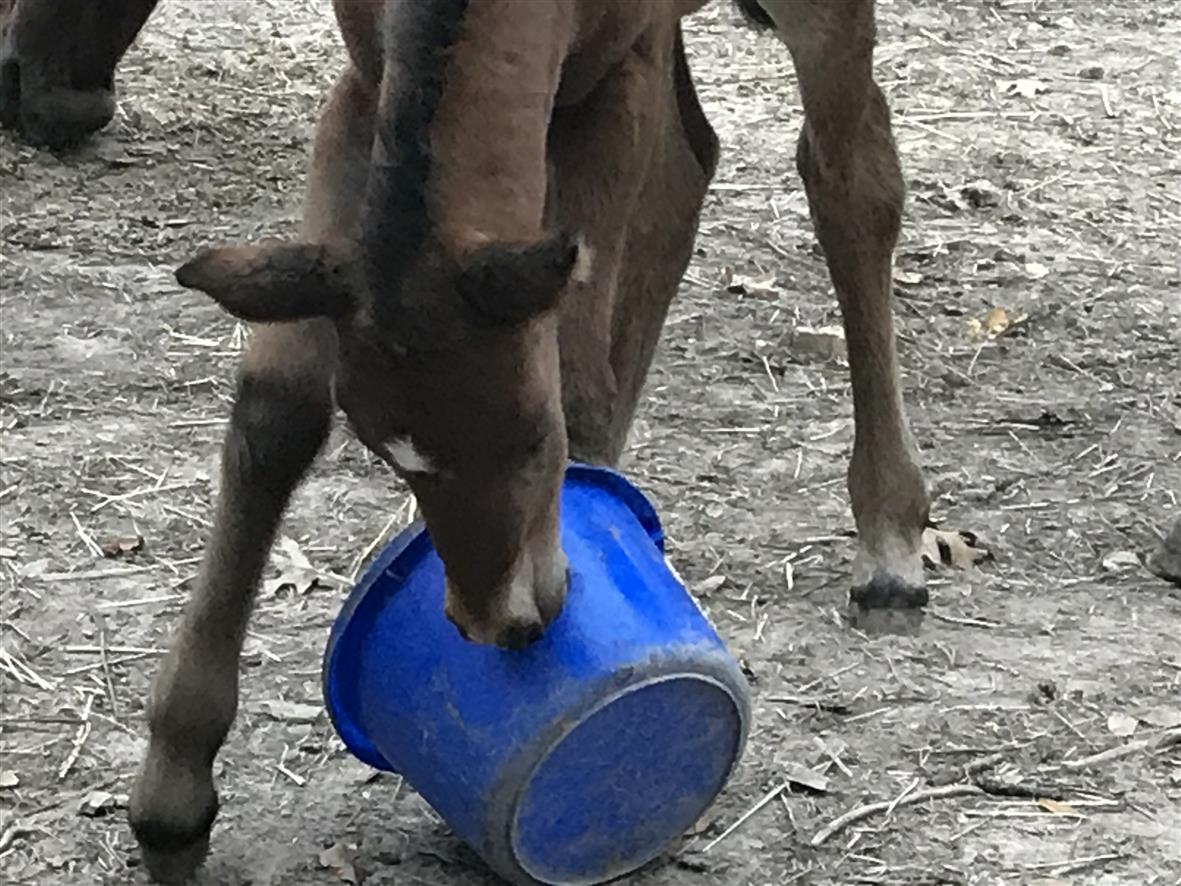 Trinket, it seems, has two speeds: Kentucky Derby and nap. Personally, I think she should nap a lot more! On her third day, she decided Mom’s bucket was da bomb and had to stick her nose and each of her feet into it, one or two at a time, of course, until it turned over. She then proceeded to “eat” Mom’s dinner; she also tosses hay in the air and pretends to eat that too. Bless her gummy little heart—it’s hilarious!