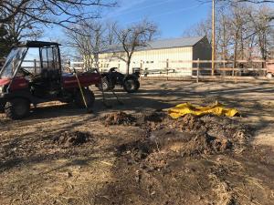 Today, for instance. I noticed a few days or so ago that there was a damp spot in the south paddock. Thought maybe it was just a pile of leaves, but we haven’t had any rain to speak of. Yesterday, I raked away the leaves and straw, and yep, a water leak. Pretty chilly yesterday, and it’s a project that takes a lot of time, so we planned it for today when it was supposed to be warmer.