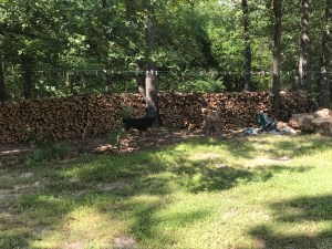 We also leave it our firewood open to the elements through September. Once fall arrives, we cover it with tarps and weigh them down with rocks—which works pretty well until the deer run through and knock it down or a big wind comes up. This year, I set them up with a rope across the top and a tarp draped over that; I used clothespins to keep the tarps attached—just like you’d do if you were sleeping in a hammock in the woods. Works like a charm.