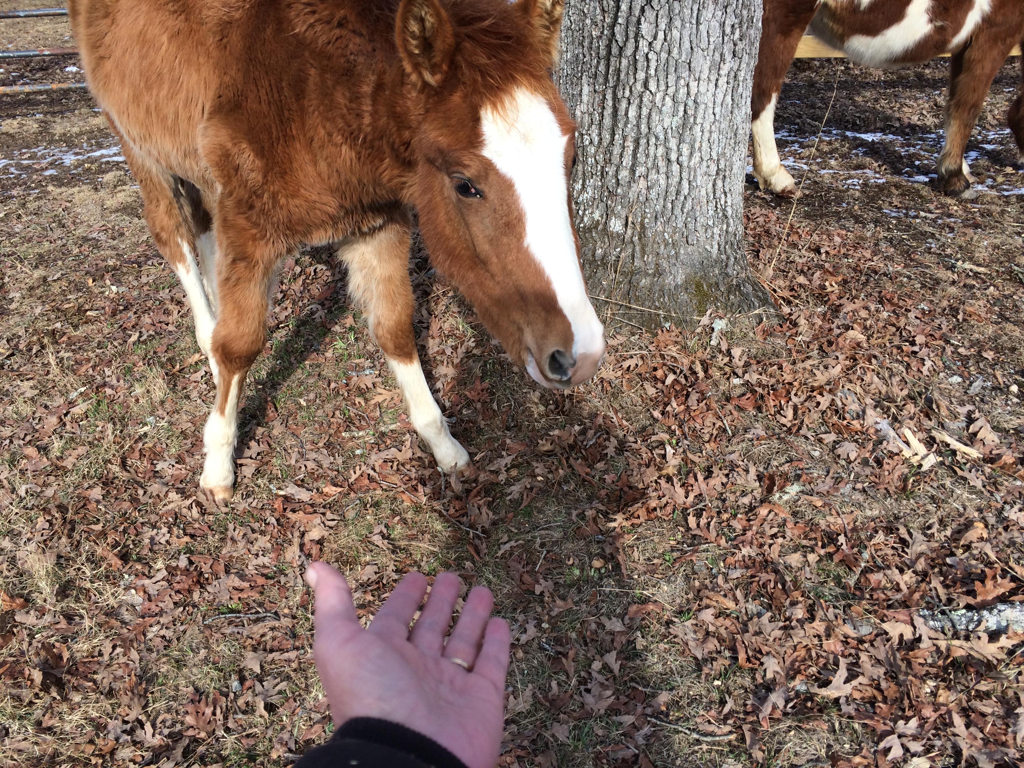 I’ve been hand feeding Cav, holding the bucket for him during the first half of breakfast or dinner. We’ve progressed from his fuzzy little forelock all the way down his face, his cheek, and just yesterday, his neck and mane. I can’t really say he “loves” it yet, but he rarely startles anymore.