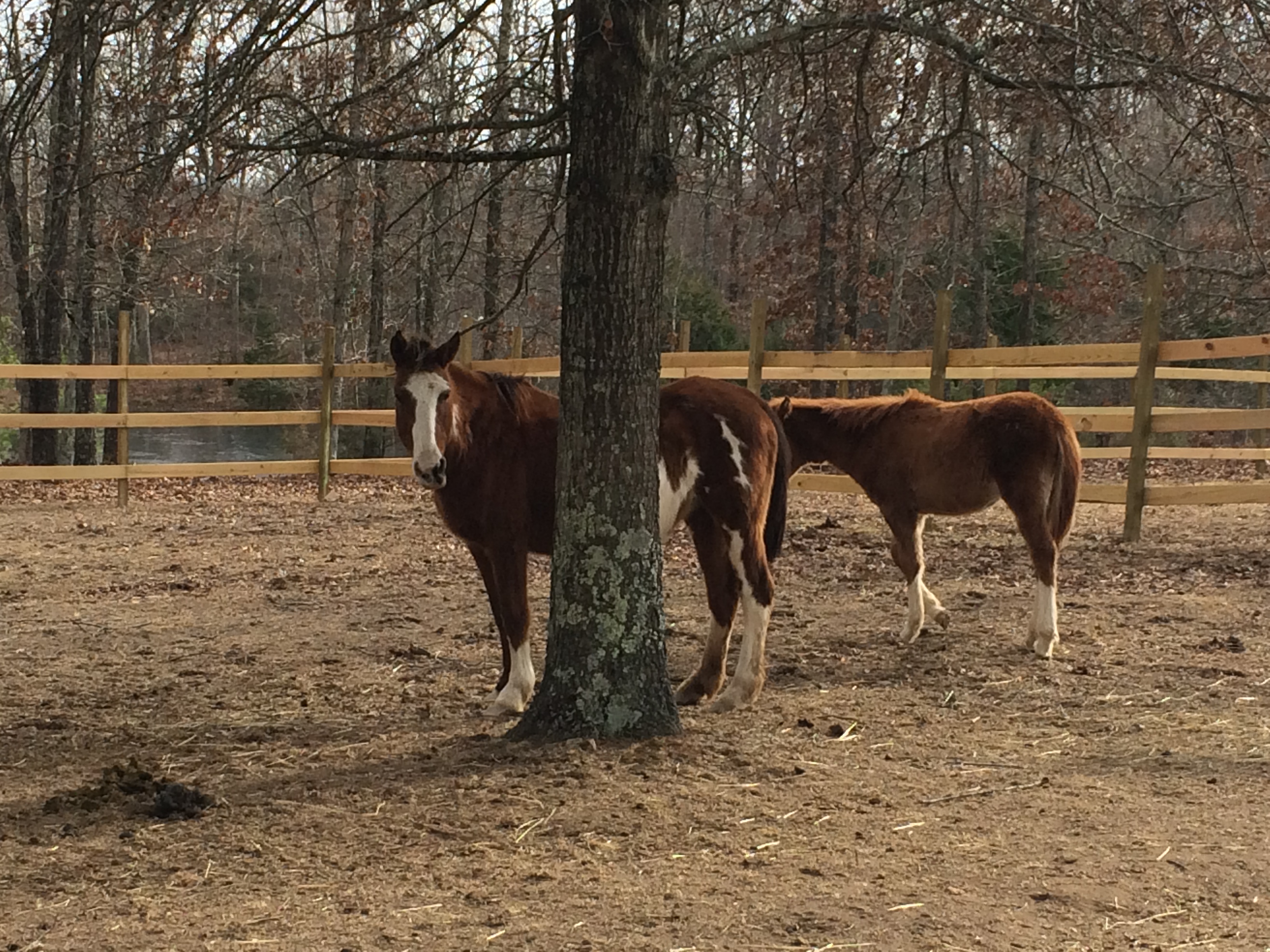 They’re both spending half a day or so in the south section of the pasture, alone most of the time. Chestnut gets her turn too, but she’s much less bitchy when she’s been separated from them for a couple hours. The grass and the ground there is better, but of course, it’s closer to the gate and the road. And with this wind lately, well, we’re doing a little fence maintenance, just in case!